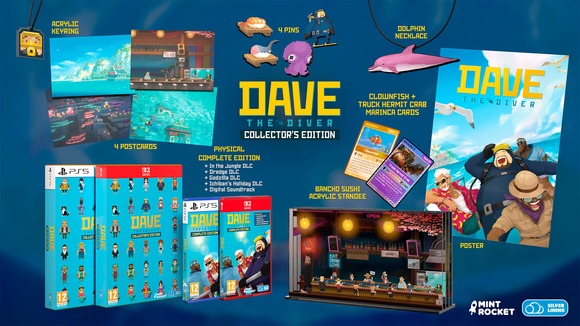 Full Physical Game (Complete in Cart/Disc) + Into the Jungle DLC + DREDGE Content Pack + Godzilla DLC + Ichiban’s Holiday DLC + Digital Soundtrack; “Bancho Sushi” Restaurant Acrylic Standee; 4 Enamel Pins; Acrylic Keyring; Dolphin Pendant Necklace; 2 Marinca Cards; Poster; 4 Portcards; and Collector’s Box
